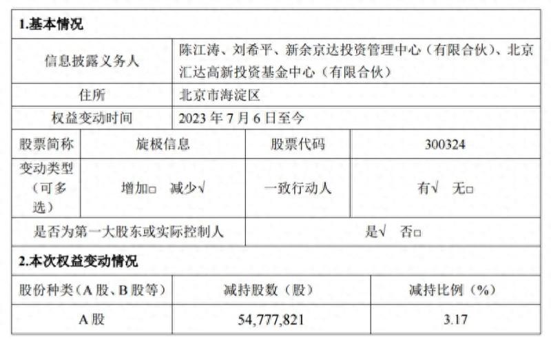 近日,旋极信息(300324.SZ)发布《关于持股5%以上股东及其一致行动人减持公司股份超过1%的公告》称,其控股股东、实际控制人陈江涛及其一致行动人因执行司法裁定减持股份5477.78万股,占公司总股本的3.17%。
