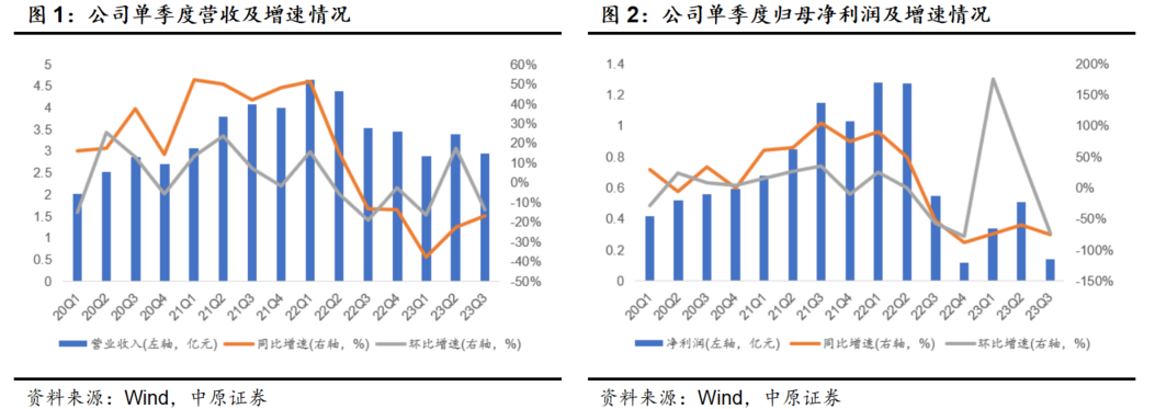 事件:近日公司发布2023年第三季度报告,2023年公司前三季度实现营收9.23亿元,同比-26.55%;归母净利润1.00亿元,同比-67.95%;扣非归母净利润0.78亿元,同比-72.85%;23Q3单季度公司实现营收2.94亿元,同比-16.95%,环比-13.46%;归母净利润0.14亿元,同比-74.76%,环比-72.90%;扣非归母净利润0.14亿元,同比-74.59%,环比-67.68%。