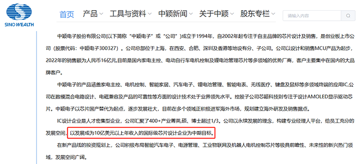 目前,中颖电子官网明确写有“以发展成为10亿美元以上年收入的国际级芯片设计企业为中期目标”的表述。此前,傅启明曾在《2021社会责任报告》的董事长致辞中提到“展望未来,中颖电子既有具体产品路线规划,也有信心在若干年内实现营收超过国际大中型行业规模的标准(10亿美元),在全球芯片设计领域展现更大影响力,并成为业界尊崇的卓越公司。”