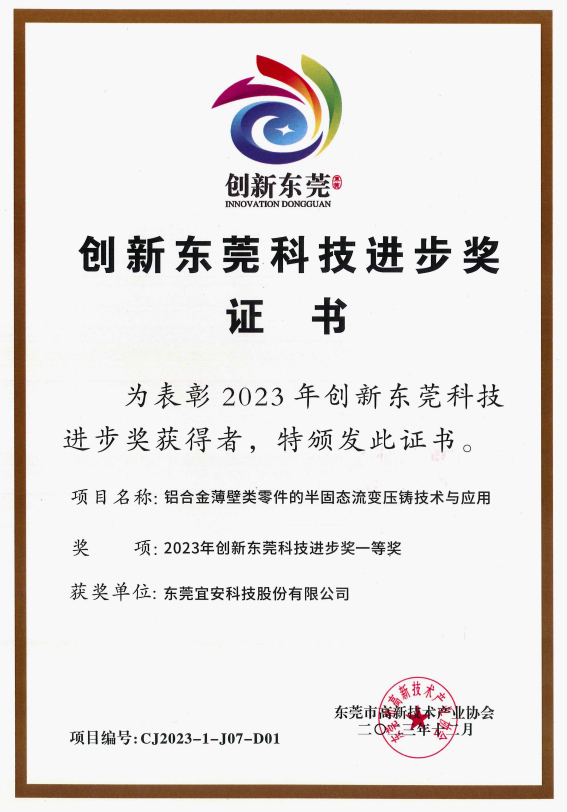 2023年12月21日,创新东莞科技奖颁奖及科技制造业企业家论坛活动在松山湖举办,公布了2023年创新东莞科技进步奖、技术发明奖、青年科技创新奖等各类奖项的获奖情况,宜安科技主导的“铝合金薄壁类零件的半固态流变压铸技术与应用”项目荣获2023年度创新东莞科技进步奖一等奖。