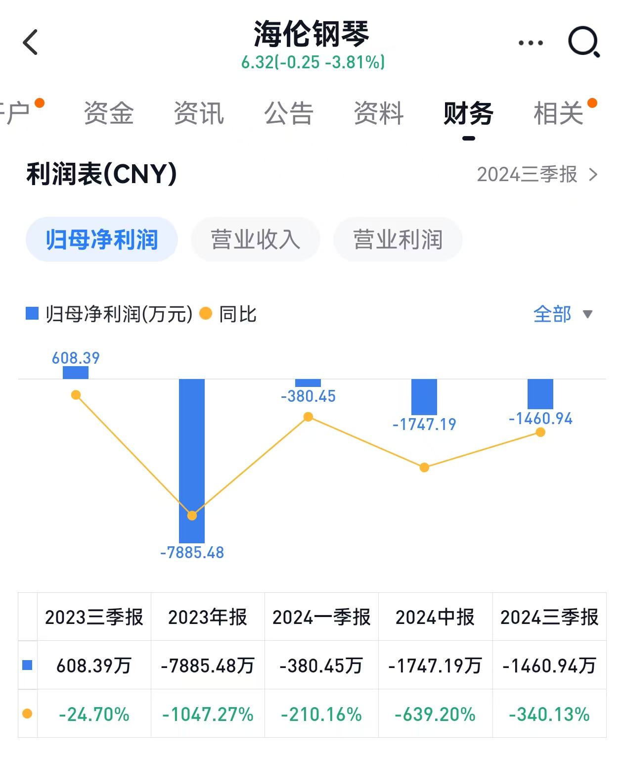 到今年一季度,2024年1月-3月,海伦钢琴实现营业收入4623.04万元,同比减少38.87%;归母净利润为亏损380.45万元,同比减少210.16%。到后续披露的2024年中报、三季度报,海伦钢琴的亏损持续,分别为亏损1747.19万元、亏损1460.94万元,分别同比下滑639.2%和340.13%。