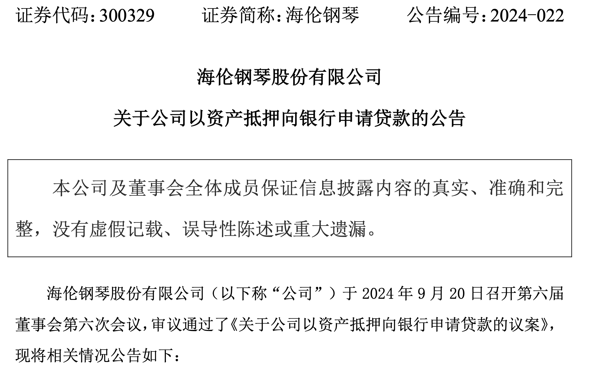 今年9月20日,海伦钢琴发布“公司以资产抵押向银行申请贷款”的公告称,为满足公司及生产经营发展需要,进一步拓宽融资渠道,降低融资成本,拟将部分自有资产抵押至中国农业银行股份有限公司宁波北仑支行用于申请贷款,账面价值9500.13万元,抵押期限以银行签订的抵押合同要求为准。