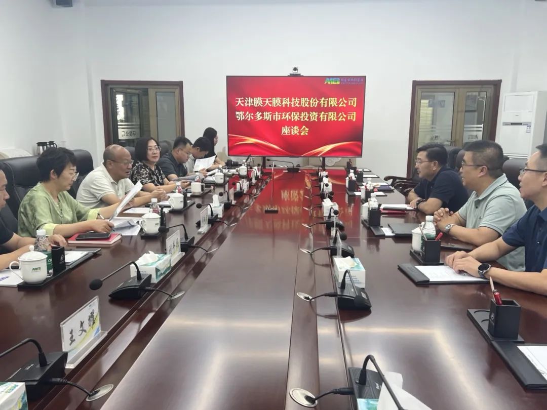 2025煤矿与煤化工环保产业大会举办之际,津膜科技董事长、总经理范宁及公司技术总监刘彬等一行,分别拜访了鄂尔多斯市环保投资有限公司、鄂尔多斯市水务投资控股集团有限公司,开展座谈交流,实地考察项目现场。环投公司董事长韩伟、总经理刘晶及公司相关部门人员,水投集团党委书记、董事长温浩、总经理张海滨及公司有关负责人分别热情接待了范宁一行。此次交流聚焦各方高度关注的高难度工业水处理领域,围绕各方优势与迫切需求,探索合作模式,推动共赢发展。