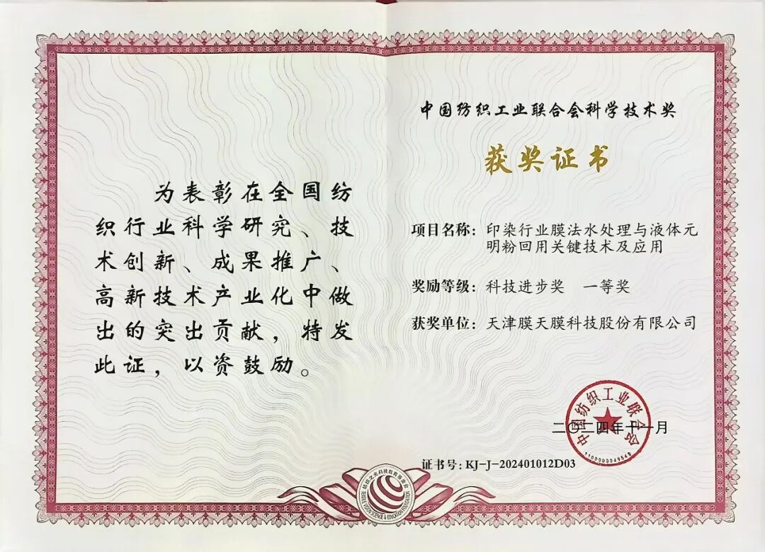 在科研实力端,津膜科技获评专精特新“小巨人”企业、国家知识产权优势企业、服务型制造示范企业、国家级高新技术企业等诸多荣誉,公司核心膜技术及装备荣获2024年国家科技进步一等奖、中国纺织工业联合会科技进步一等奖等重磅奖项,自主研发的“新型脉冲曝气膜生物反应器”“压力式中空纤维膜过滤集成装备”成功入选《天津市首台(套)重大技术装备推广应用指导目录(2025版)》,多项技术实现对进口膜的替代。