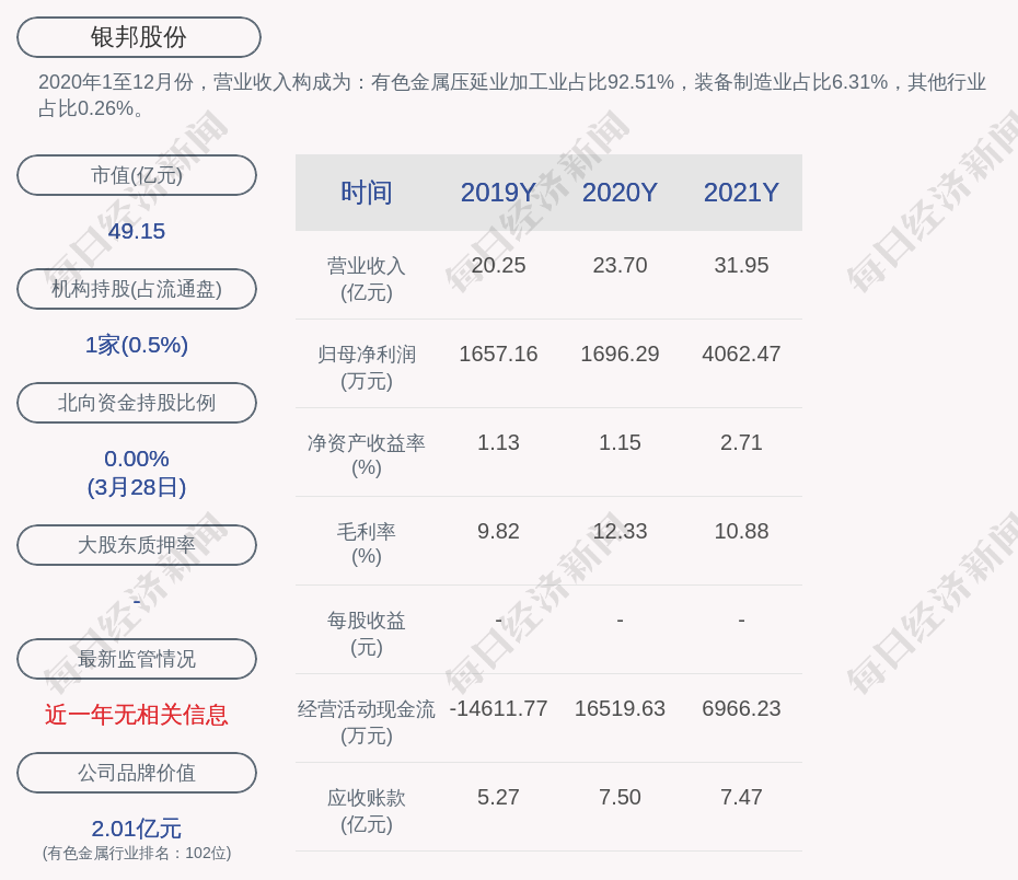 2020年1至12月份,银邦股份的营业收入构成为:有色金属压延业加工业占比92.51%,装备制造业占比6.31%,其他行业占比0.26%。