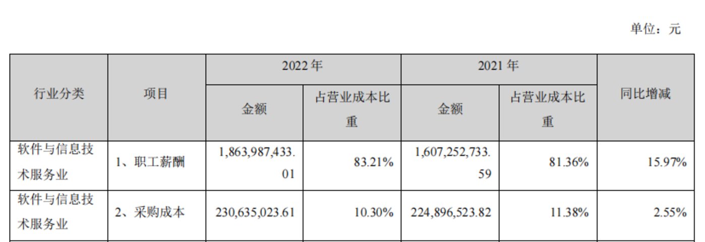 具体看来,润和软件主营成本22.07亿元,较2021年增加2.6亿元,同比增长13.38%。其中,职工薪酬支出18.64亿元,占营业成本的比重为83.21%,较2021年增加2.57亿元。由于薪酬支付较上年同期增加,经营现金流同比下滑37.93%至9079.17万元。