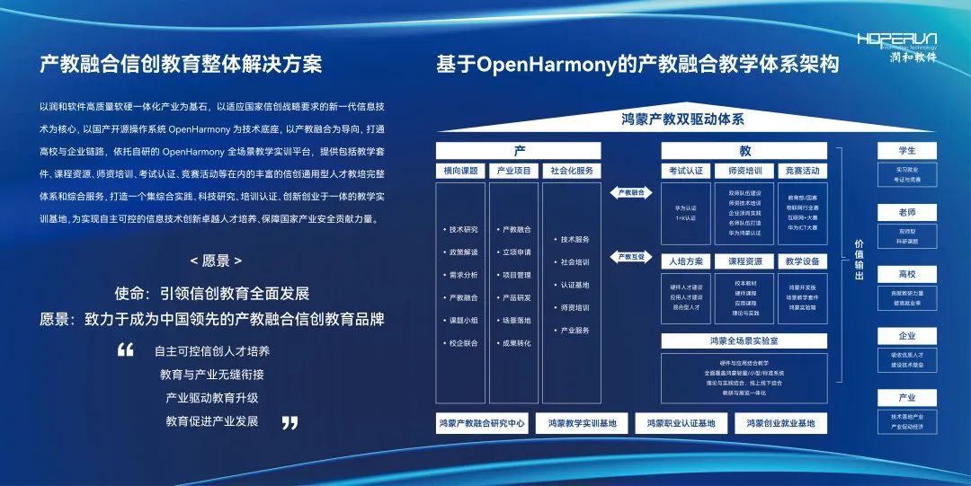 以国产化教学和信创人才培养为导向,润开鸿打造了一套完整的以“产教融合”为主题的OpenHarmony信创人才培养解决方案并在本届中国教育装备展上正式发布,该方案的总体目标是“通过产教融合的模式在高校开展以OpenHarmony等为底座的国产化软硬件教学,培养复合型信创人才,打造信创教育高地”;具体措施为分层级打造全场景、立体化的高校OpenHarmony信创人才培养体系及相应的使能服务。
