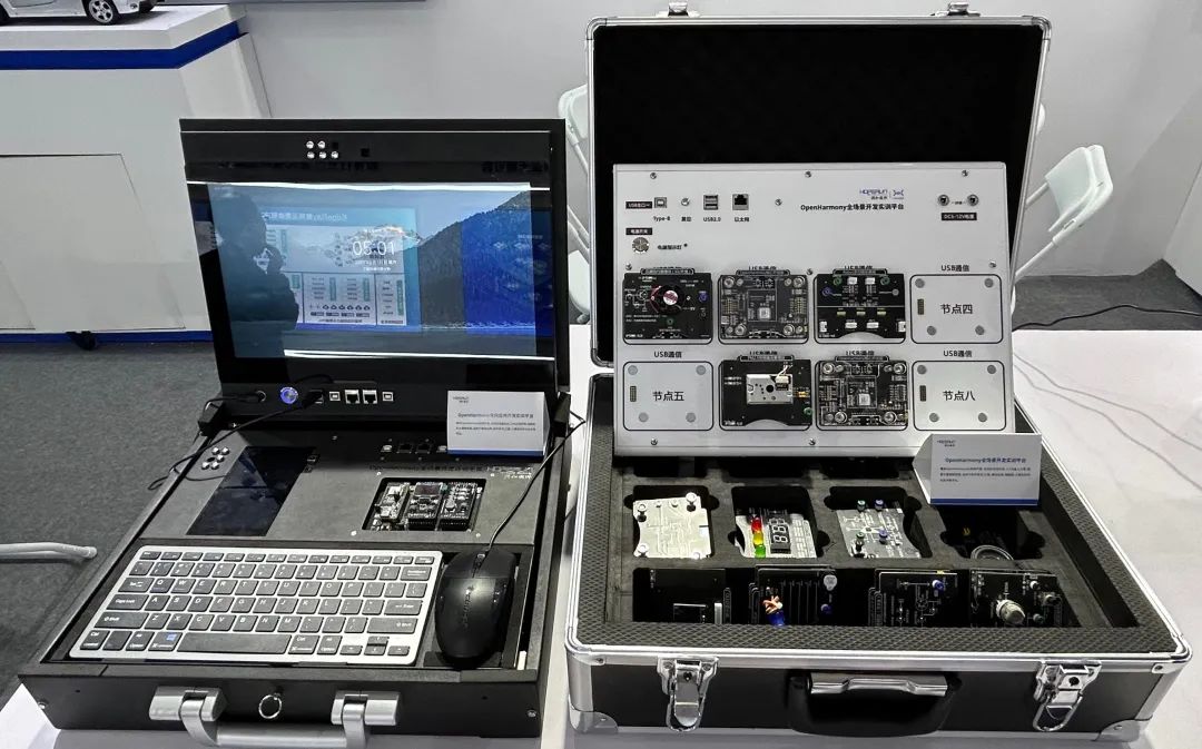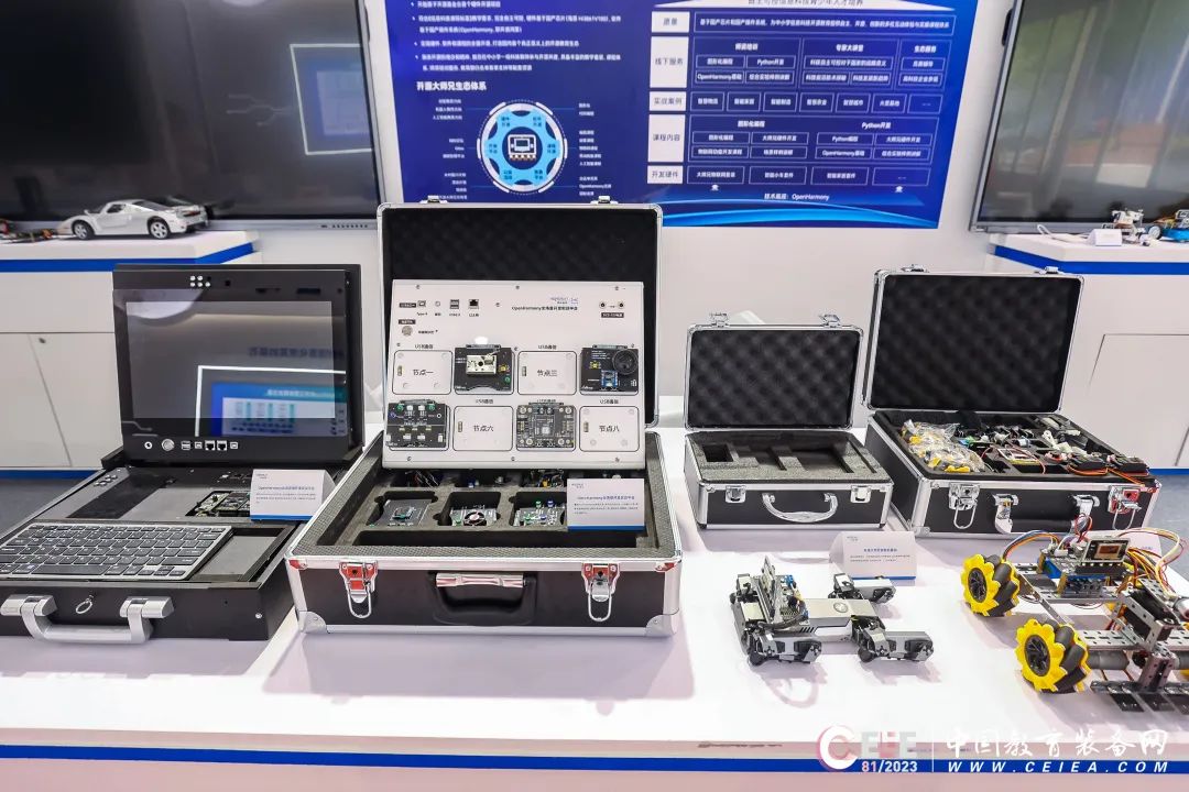 其中,面向高校信创教育的展品分为OpenHarmony实训平台、行业解决方案样例及满天星系列教具三类。