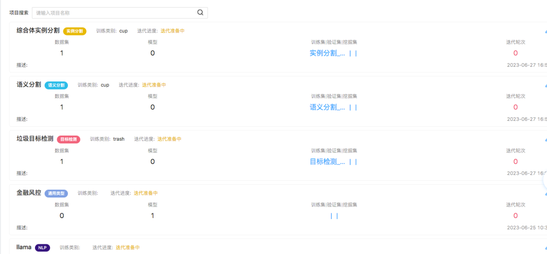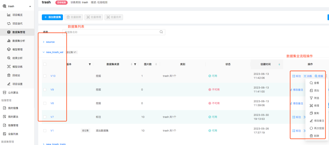 功能包括:数据导入、数据查看、数据编辑、版本管理、数据预处理、数据挖掘、数据标注、数据推理。