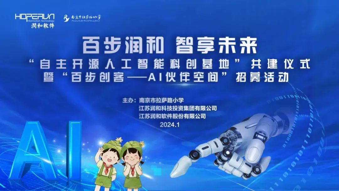 2024年1月5日新年伊始,江苏润和软件股份有限公司(以下简称“润和软件”)与南京市拉萨路小学(以下简称“拉萨路小学”或“拉小”)联合举办了隆重的“自主开源人工智能科创基地”共建仪式。本次仪式活动在南京市拉萨路小学进行,以“百步润和,智享未来”为主题,拉萨路小学党总支书记严瑾、副校长刘宁、副校长郭静、副校长单薇洁,江苏软件产业人才发展基金会常务副秘书长、“芯火”行动推进工作小组组长皇青,润和软件副总裁束岚、党委副书记兼纪委书记韩波、工会常务副主席蔡良、开源鸿蒙智慧教育总经理张武伟以及生态市场总经理丽娜出席了仪式,与现场观礼的百余位师生代表、媒体记者们共同参与并见证了本次共建仪式。