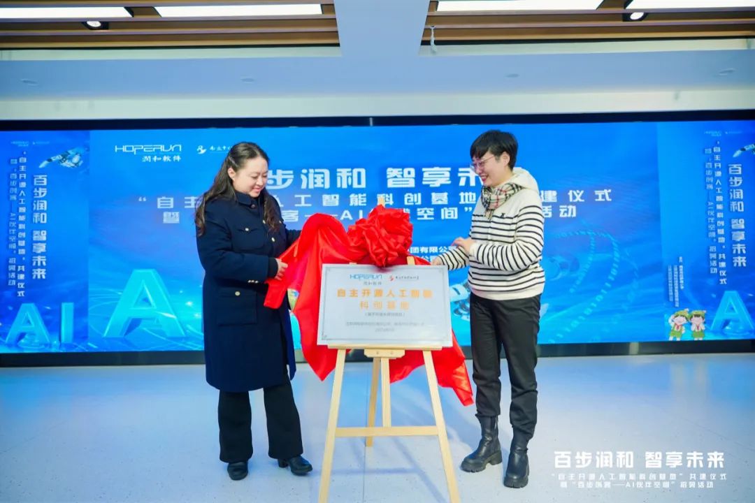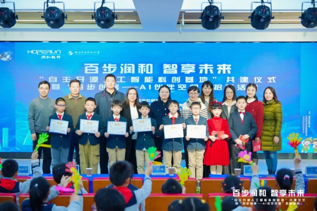 本次仪式的重磅环节是润和软件与拉萨路小学共建的“自主开源人工智能科创基地”揭牌,润和软件副总裁束岚与拉萨路小学党总支书记严瑾亲手为基地揭牌,在场嘉宾和同学们共同见证了这一重要时刻。
