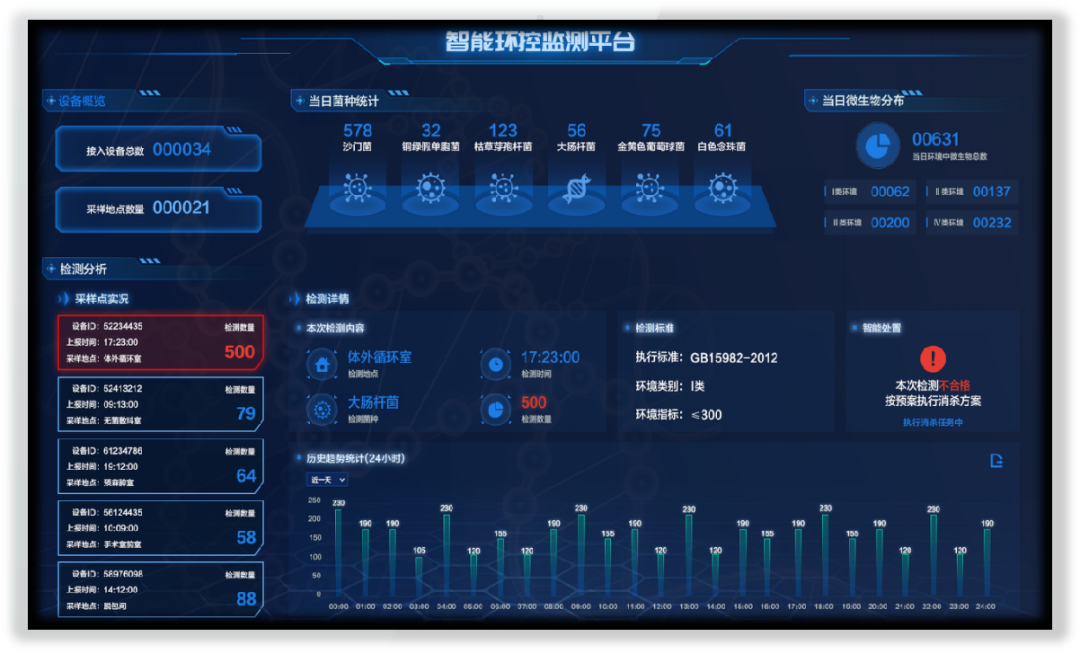 ●智能感知:可实时获取病毒、细菌的种类、形成全场景自动化感控物联监测,持续为多场景提供卫生环境数据。