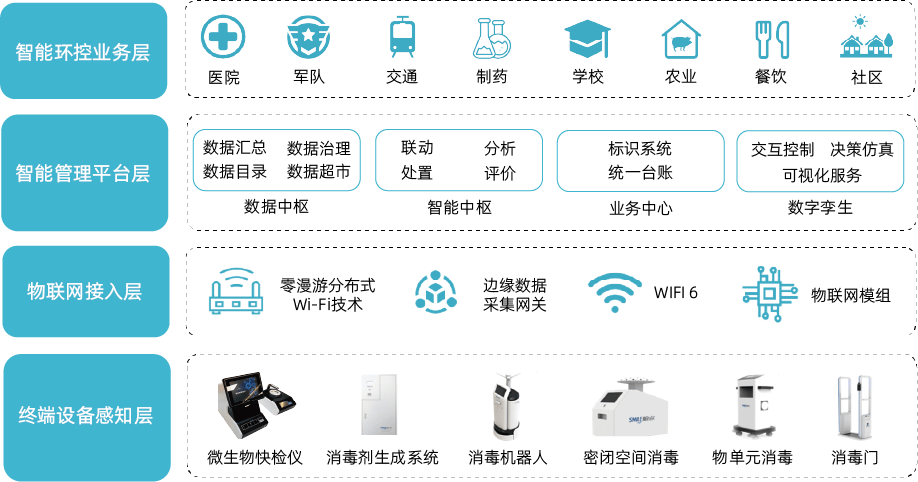 润和软件智慧环控系统能为医疗机构、舱室空间等持续提供卫生环境数据,开展环境控制消杀作业。未来,随着消杀机器人等边缘侧智能执行单元的进一步研发与配套丰富,该系统将可满足医疗卫生、生物制药、食品安全、军队安防、海关安检以及生态环境检测等多领域具体场景下的微生物防控、侦测、控制和评估全流程闭环,全面提升检测效率,降低环境感控及消杀成本。