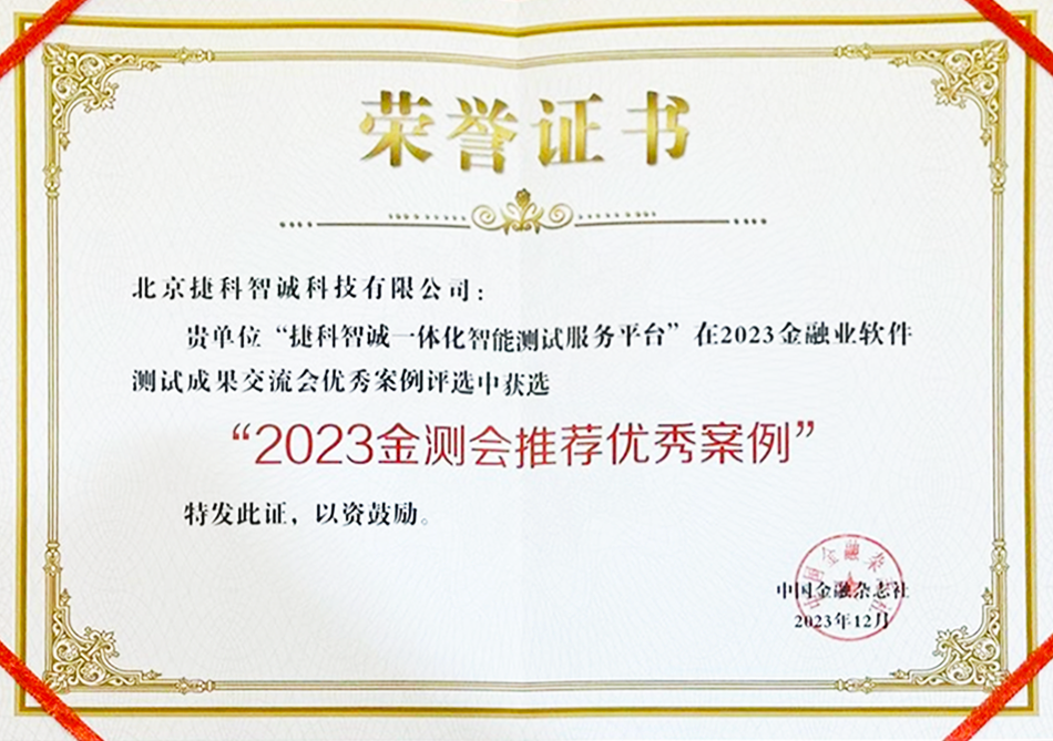 为了进一步扩大金测会的成果和影响力,拓宽成功经验的展示平台和分享渠道,本次金测会还发布了“金测会推荐优秀案例”。捷科智诚一体化智能测试服务平台,凭借其全生命周期的测试管理能力、AI智能自动化测试能力、AI性能测试能力、配套的一体化解决方案能力、行业占有率等诸多优势脱颖而出,真正为众多金融机构带来质效的双重提升,荣获得2023中国金融业软件测试成果交流会推荐优秀案例。