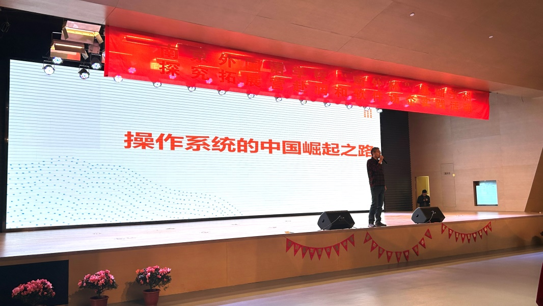 在专家大讲堂环节,润开鸿智慧教育科普专家冯培兢老师以《操作系统的中国崛起之路》为主题,给同学们分享了国产自主科技的发展。冯老师强调,在国家数字经济与网络强国战略中,基础软件是基石和重要保障,操作系统作为最重要的基础软件,首先要实现自主可控。