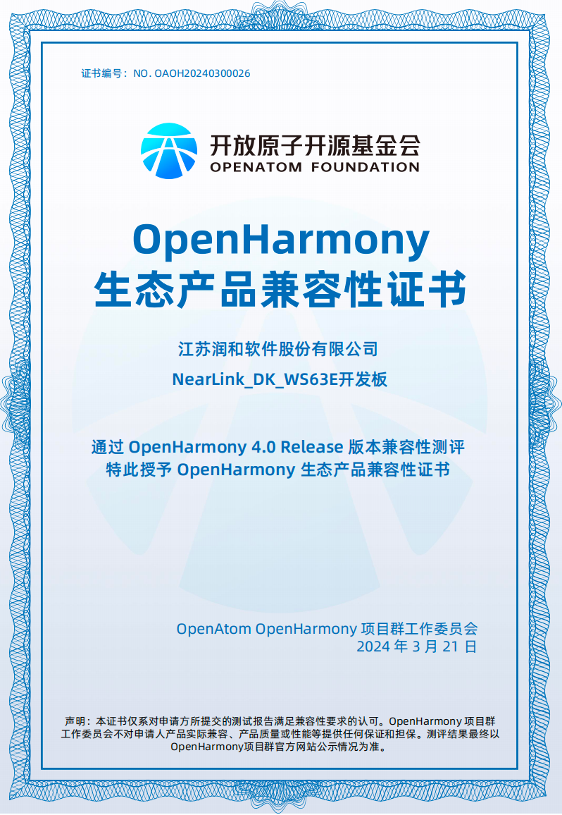 NearLink_DK_WS63E开发套件获得OpenHarmony生态产品兼容性证书