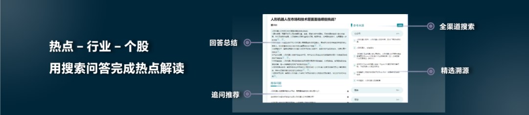 “金融搜一搜”聚焦AI大模型、自然语言处理、知识图谱等技术,对全网数据、资讯事件、观点逻辑等信息进行自动化处理和分析。该产品在金融领域应用的优势大概有以下几点: