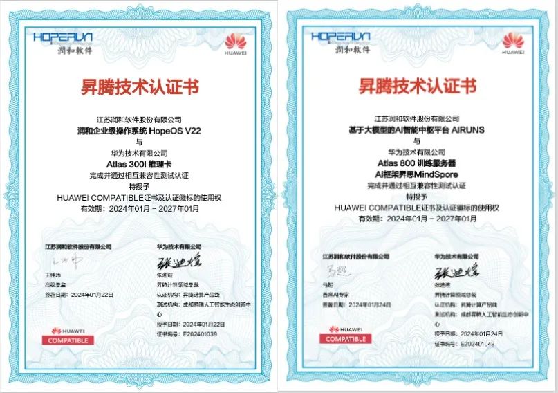 润和软件企业级安全操作系统 HopeOS、基于大模型的AI中枢平台AIRUNS已与华为昇腾通过相互兼容性测试认证