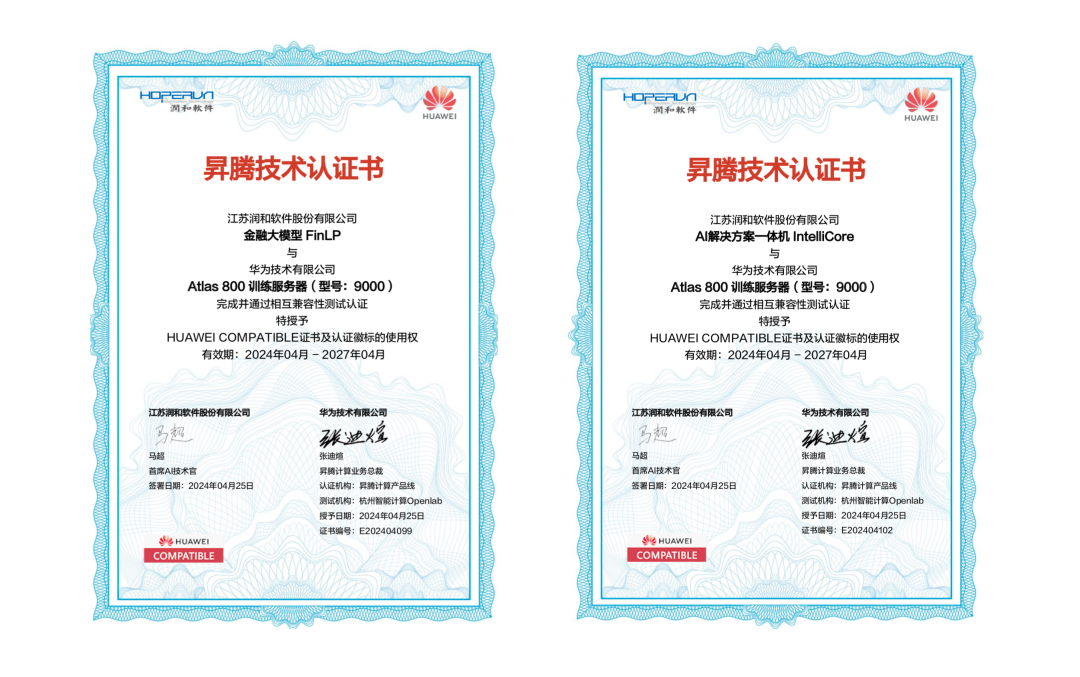 润和软件IntelliCore AI解决方案一体机和金融大模型FinLP与华为昇腾通过相互兼容性测试认证