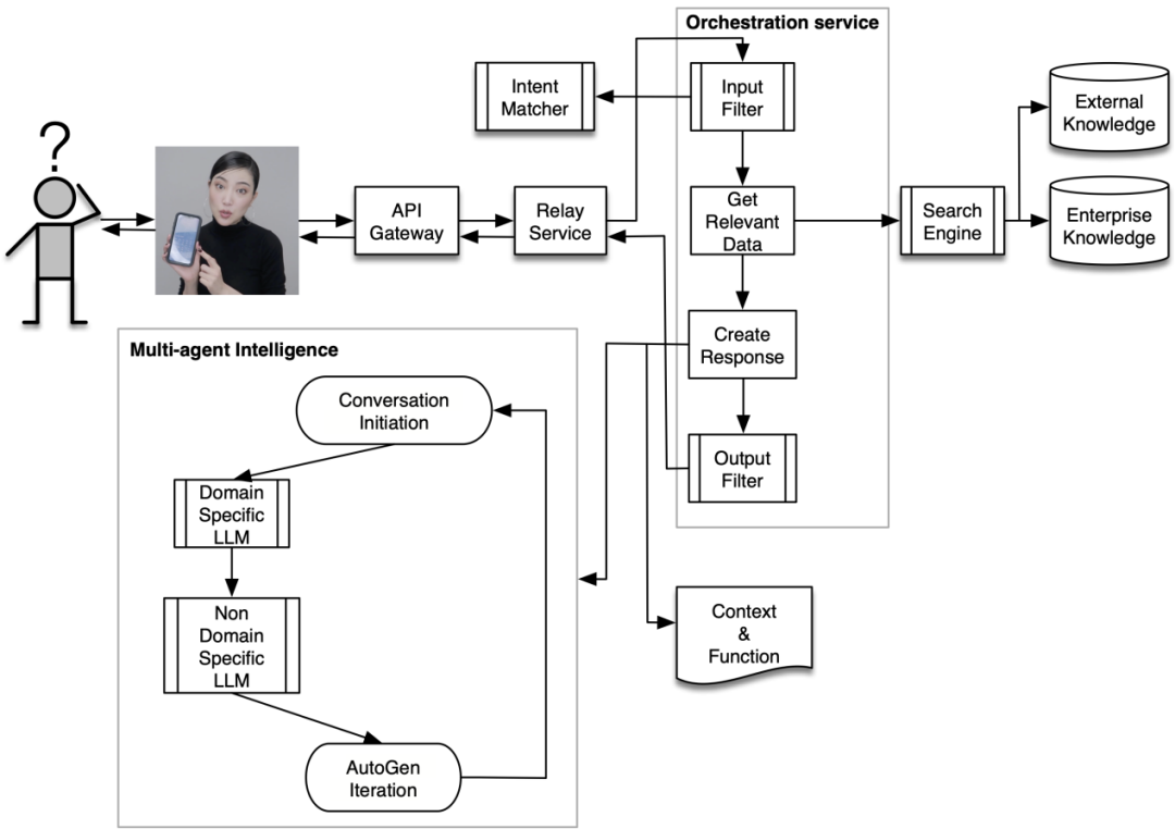 4.多Agent智能涌现技术驱动的问答系统来回答用户提出的针对特定领域或非特定领域提出的问题。该架构包含多项服务,用于创建即插即用模型以减少供应商锁定,下图提供了解决方案包的架构图。