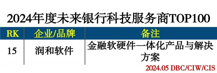 润和软件荣获“2024年度未来银行科技服务商百强榜”第15位
