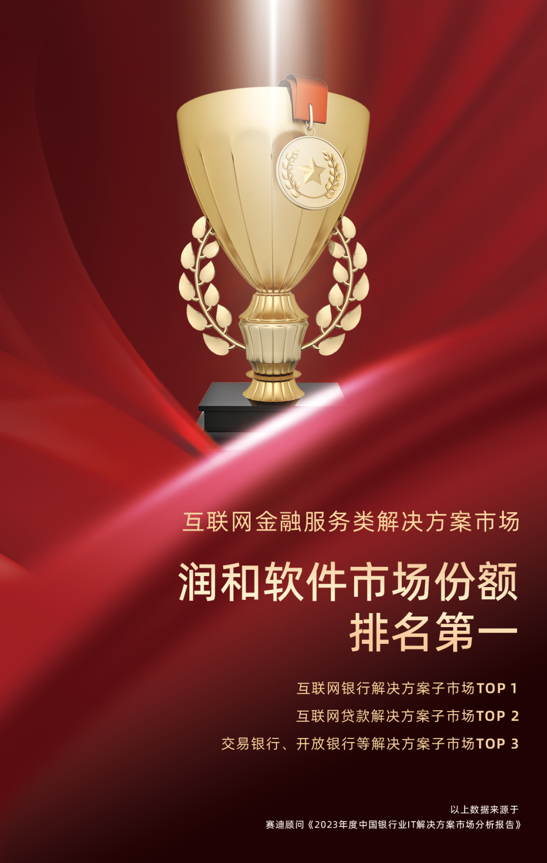 近日,工信部下属研究机构赛迪顾问发布《2023年度中国银行业IT解决方案市场份额分析报告》(以下简称《报告》)。江苏润和软件股份有限公司(以下简称“润和软件”)凭借软硬件一体化产品与解决方案能力及全生命周期软件服务体系,连续三年蝉联互联网金融服务类解决方案市场占有率第一。在细分领域:互联网银行解决方案子市场更是连续四年霸榜第一,互联网贷款解决方案子市场稳居第二名,交易银行、开放银行等解决方案子市场跃升至第三名。