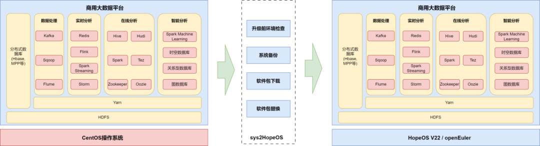 润和软件基于自身对大数据技术架构的深入理解以及长期的技术实践,在方案开发设计阶段已完全满足HDP各主流版本向润和软件企业级操作系统(HopeOS V22)或openEuler开源版本的迁移需求,客户可通过润和软件自动化迁移工具sys2HopeOS自动化无人值守地实现操作系统平滑迁移。
