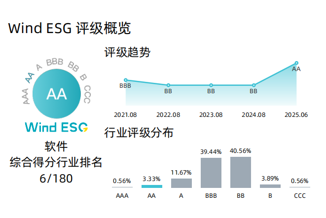 据公开信息显示,Wind ESG评级体系以ESG内涵为基础,以数据驱动为核心,接轨国际标准和评估框架,根据中国企业发展特色和资本市场现状,通过科学严谨的方法学,预见性地评估企业实质性ESG风险及其可持续经营的能力。Wind ESG评级结果与底层数据已全面覆盖A股、港股上市公司,公募信用债发债主体及国内公募基金。Wind ESG评级提供全透明底层数据及评分结果,将ESG数据与政策制定、基本面分析、量化投资、风险管理、指数编制等进行深度整合,已成为当前资本市场广受关注和认可的ESG评价体系之一,评级结果已成为展示企业ESG工作成果并树立优秀资本市场形象的重要平台。Wind ESG评级体系将获得AA评级的企业认定为“企业管理水平高,ESG风险低,可持续发展能力强”,在软件行业,仅有3.33%的公司能够达到这一标准。