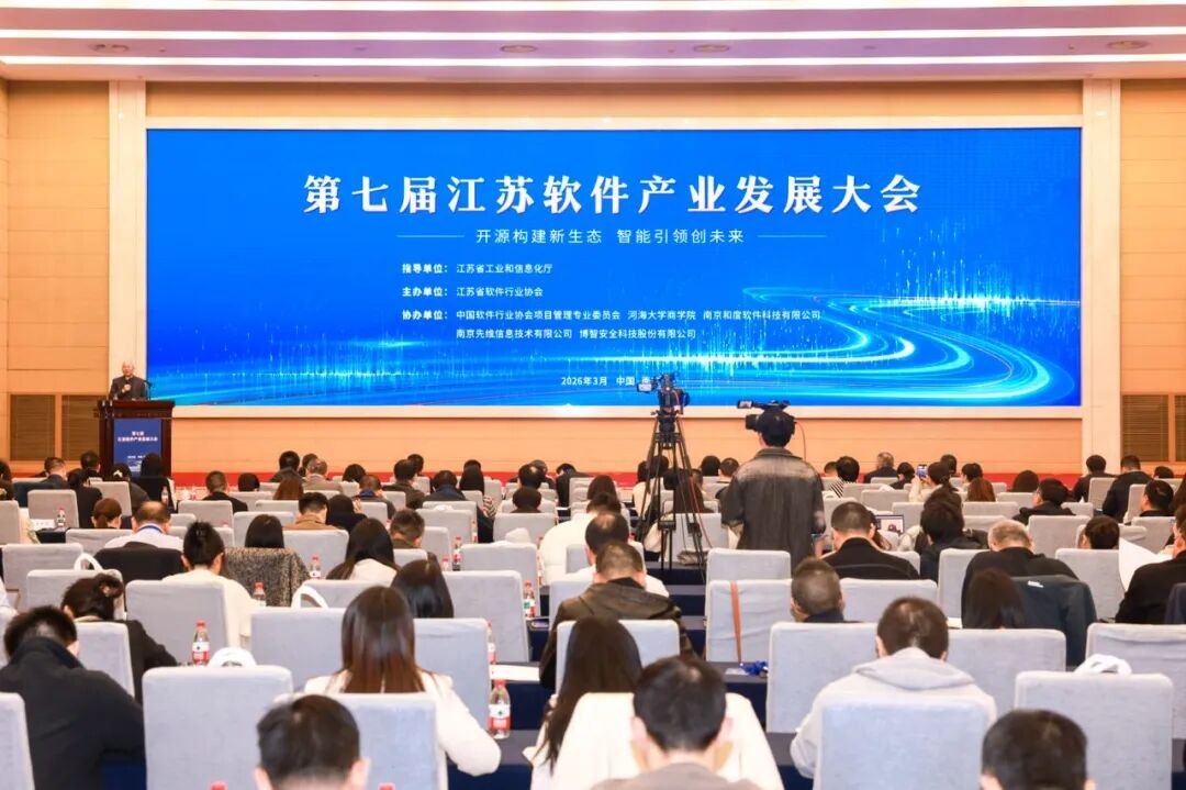 2026年3月28日,第七届江苏软件产业发展大会在南京举行。本届大会由江苏省工业和信息化厅指导、江苏省软件行业协会主办,以“开源构建新生态、智能引领创未来”为主题,共同探讨智能经济时代软件产业的创新和发展。来自省内外的企业、高校、科研院所、学会、协会代表400多人参加会议。