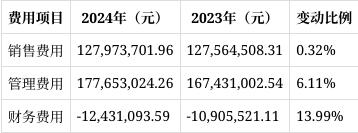 2024年公司销售费用为127,973,701.96元,较上年的127,564,508.31元增长0.32%,变动幅度较小。管理费用177,653,024.26元,同比增长6.11%,主要是人工费用、办公费用等增加所致。财务费用为-12,431,093.59元,较上年的-10,905,521.11元,绝对值有所增加,主要因公司本期定存利息增加及汇率影响。