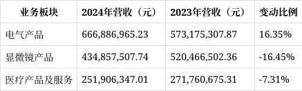 2024年,麦克奥迪实现营业收入1,353,650,819.98元,较上年同期的1,365,402,485.54元下降0.86%。从业务板块来看,电气产品收入666,886,965.23元,同比增长16.35%;显微镜产品收入434,857,507.74元,同比下降16.45%;医疗产品及服务收入251,906,347.01元,同比下降7.31%。公司整体营业收入的微降主要源于显微镜产品业务的减少。