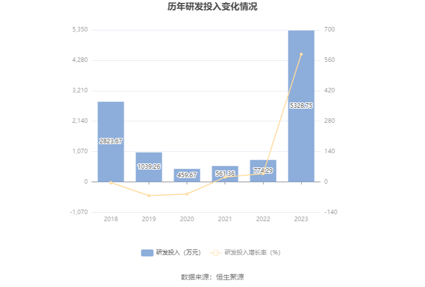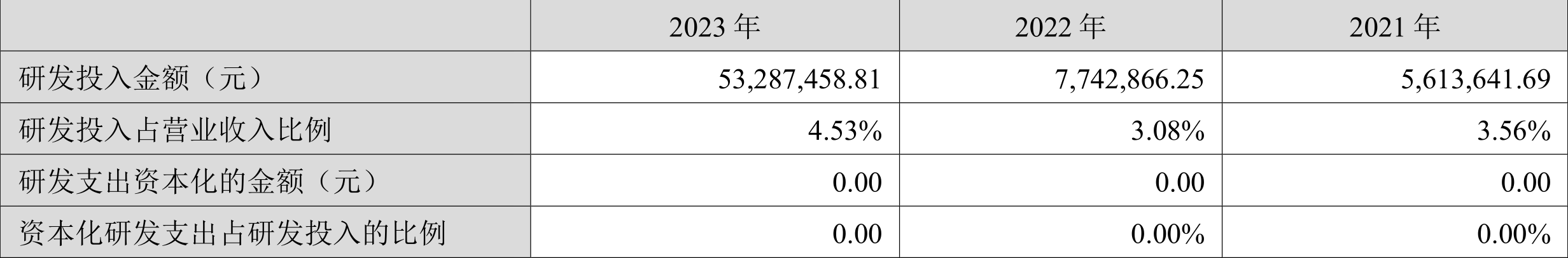 2023年全年,公司研发投入金额为5328.75万元,同比增长588.21%;研发投入占营业收入比例为4.53%,相比上年同期上升1.45个百分点。此外,公司全年研发投入资本化率为0。