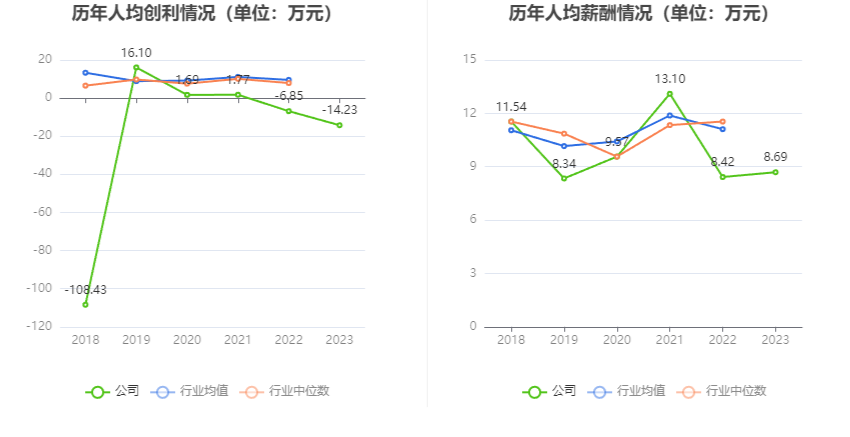 截至2023年末,公司员工总数为1393人,人均创收84.37万元,人均创利-14.23万元,人均薪酬8.69万元,较上年同期分别变化72.58%、-107.58%、3.29%。