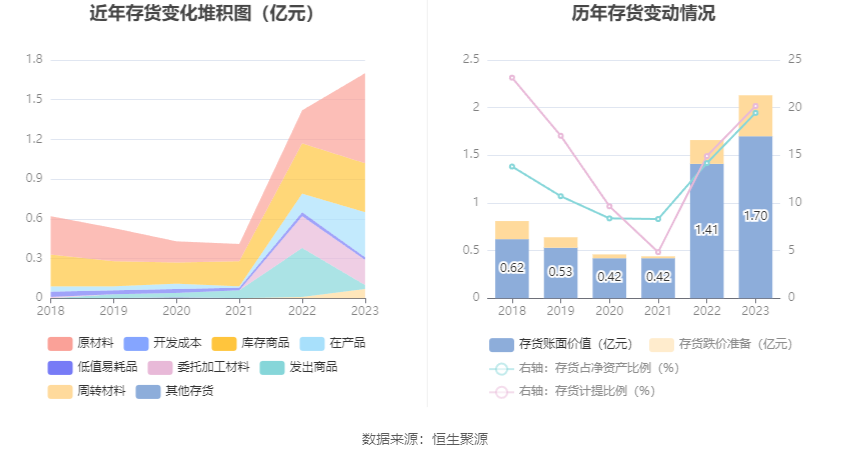 从存货变动来看,截至2023年年末,公司存货账面价值为1.7亿元,占净资产的19.45%,较上年末增加2938.74万元。其中,存货跌价准备为4298.46万元,计提比例为20.17%。