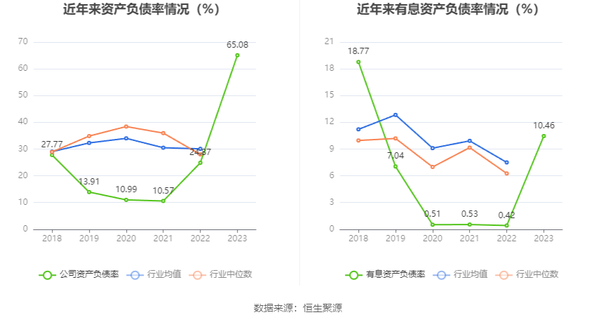 在偿债能力方面,公司2023年年末资产负债率为65.08%,相比上年末上升40.21个百分点;有息资产负债率为10.46%,相比上年末上升10.04个百分点。