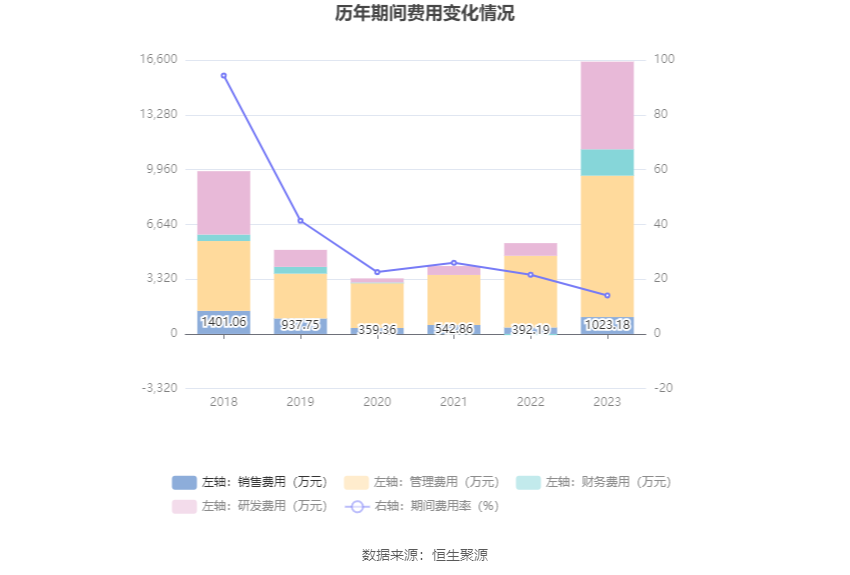 2023年,公司期间费用为1.65亿元,较上年同期增加1.11亿元;但期间费用率为14.04%,较上年同期下降7.57个百分点。其中,销售费用同比增长160.89%,管理费用同比增长97.26%,研发费用同比增长591.66%,财务费用由去年同期的-72.71万元变为1598.38万元。