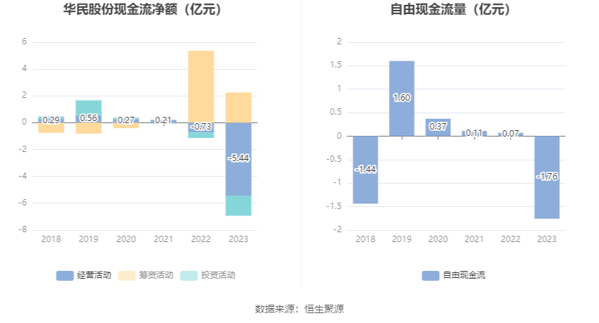 进一步统计发现,2023年公司自由现金流为-1.76亿元,上年同期为0.07亿元。