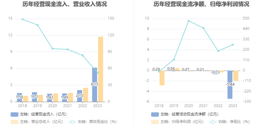 2023年,公司经营活动现金流净额为-5.44亿元,同比减少4.71亿元;筹资活动现金流净额2.25亿元,同比减少3.11亿元;投资活动现金流净额-1.50亿元,上年同期为-4097.47万元。