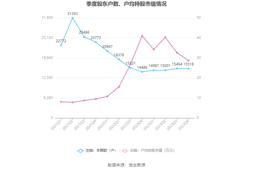 筹码集中度方面,截至2023年年末,公司股东总户数为1.55万户,较三季度末增长了24户,增幅0.15%;户均持股市值由三季度末的32.62万元下降至28.66万元,降幅为12.14%。