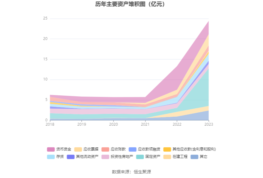 资产重大变化方面,截至2023年年末,公司固定资产较上年末增加834.63%,占公司总资产比重上升30.38个百分点;货币资金较上年末减少43.83%,占公司总资产比重下降30.21个百分点;在建工程较上年末减少1.85%,占公司总资产比重下降3.98个百分点;投资性房地产较上年末减少2.02%,占公司总资产比重下降3.96个百分点。
