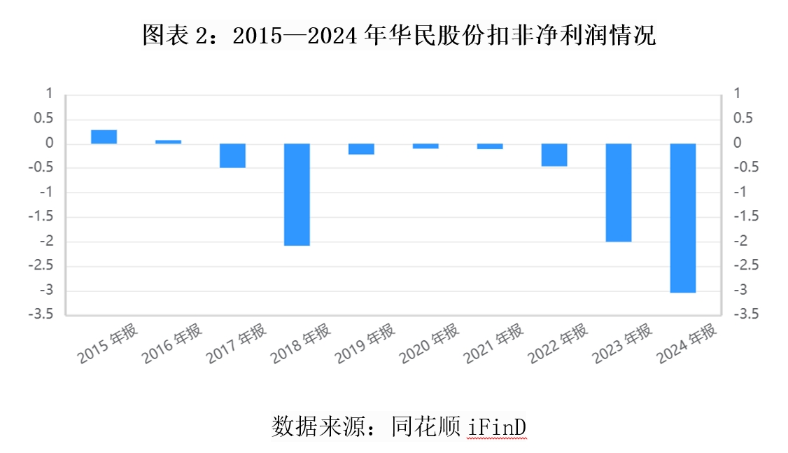 在业绩方面,2022年跨界光伏并未扭转华民股份的连续亏损局面,2024年其归母净利润亏损2.98亿元,创历史新高。2022—2024年,华民股份归母净利润连续亏损3年;而从扣非净利润来看,实际上2017—2024年华民股份已连续亏损8年。