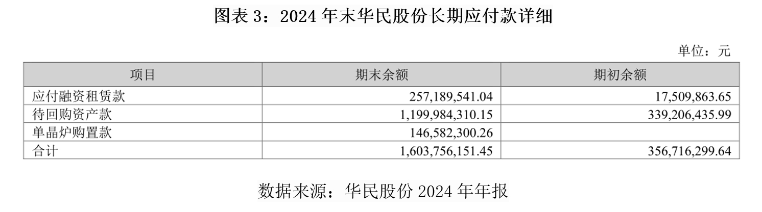 华民股份资产负债率的增加主要与“长期应付款”大增有关。2024年末,华民股份的长期应付款达16.04亿元,同比增长349.3%。华民股份的长期应付款包括应付融资租赁款、待回购资产款等。