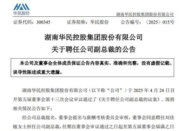 华民股份(SZ300345)近日正式对外宣布了一项重要的人事任命,刘佳敏被聘任为公司副总裁。这一消息引起了业界的广泛关注。