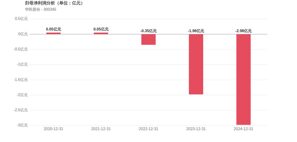 利润角度分析,2020年华民股份实现归母净利润0.05亿元,2024年为-2.98亿元。公司盈利能力持续承压,连续多年出现亏损。