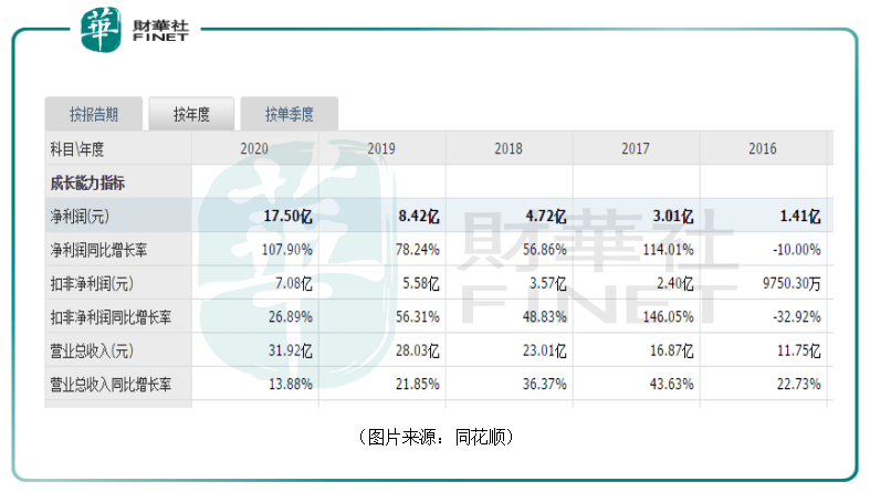 数据显示,2020年,该公司实现营收31.92亿元,同比增长13.88%,实现净利润17.5亿元,同比增长107.9亿元。