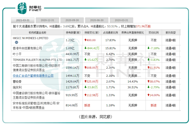 截至2021年一季度末,该公司的前十大流通股东中就有香港中央结算有限公司、中欧基金、中央汇金等机构。