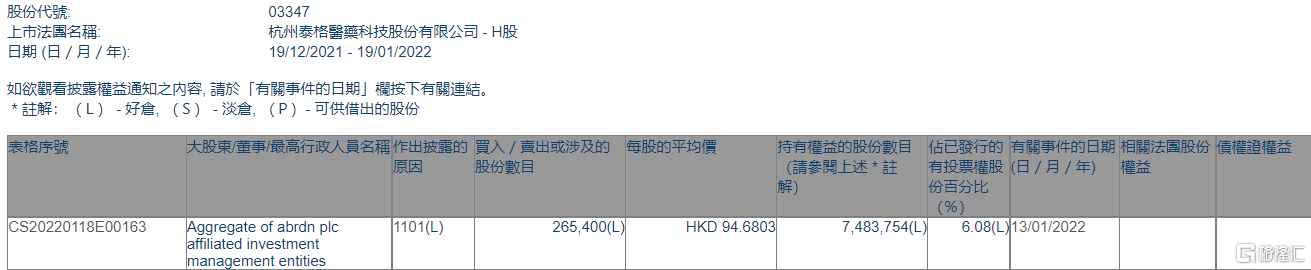 格隆汇APP获悉,根据联交所最新权益披露资料显示,2022年1月13日,泰格医药(03347.HK)获Aggregate of abrdn plc affiliated investment management entities在场内以每股均价94.6803港元增持26.54万股,涉资约2512.82万港元。
