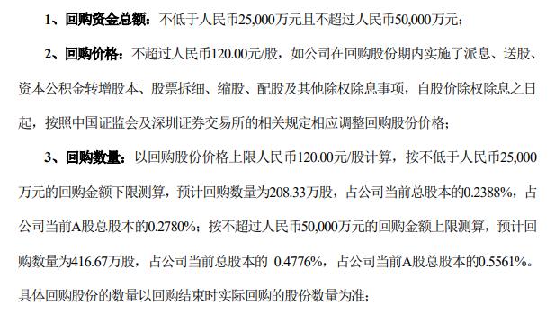 以回购股份价格上限120.00元/股计算,按不低于2.5亿元的回购金额下限测算,泰格医药回购数量为208.33万股,占公司当前总股本的0.2388%,占公司当前A股总股本的0.2780%;按不超过5亿元的回购金额上限测算,预计回购数量为416.67万股,占公司当前总股本、当前A股总股本的比例分别为0.4776%、0.5561%。