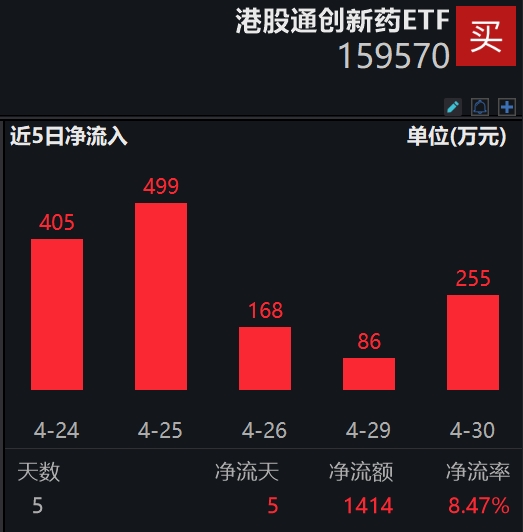 从资金净流入方面来看,港股通创新药ETF近5天获得连续资金净流入,最高单日获得499.47万元净流入,合计“吸金”1414.29万元,日均净流入达282.86万元。
