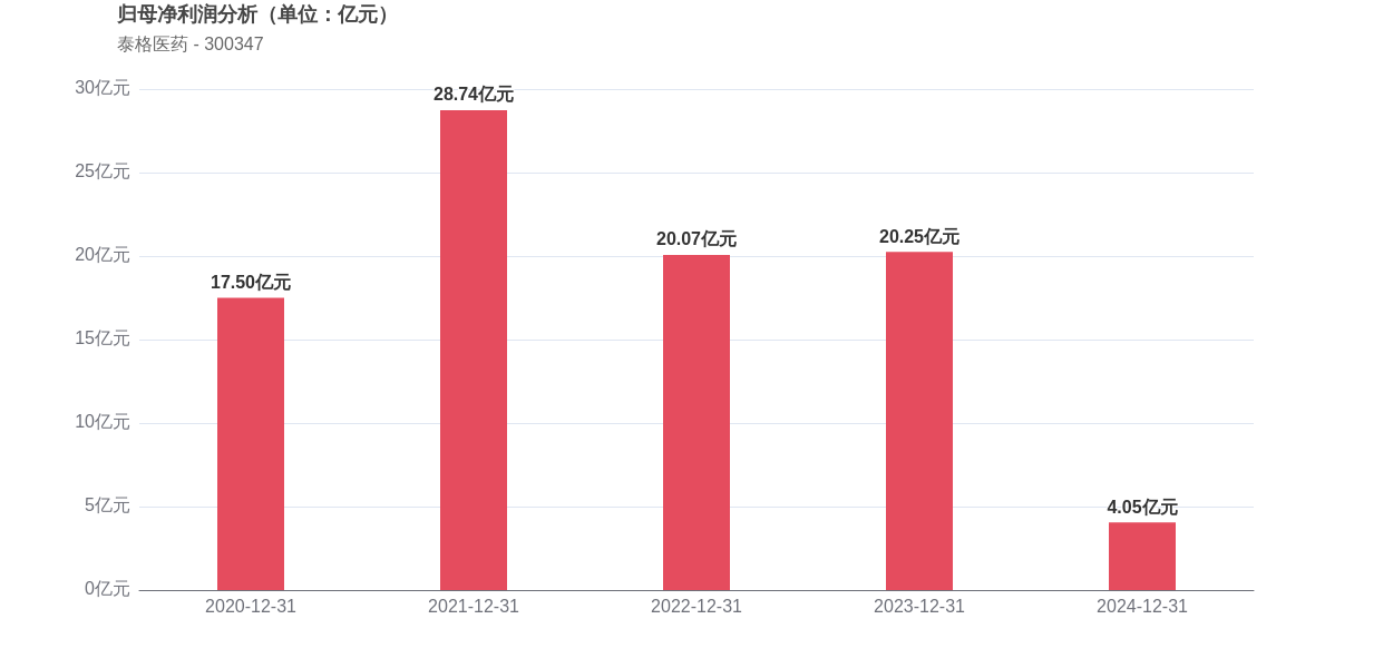 利润角度分析,2020年泰格医药实现归母净利润17.50亿元,2024年4.05亿元。近年来利润出现较大波动,2024年同比下降79.99%。